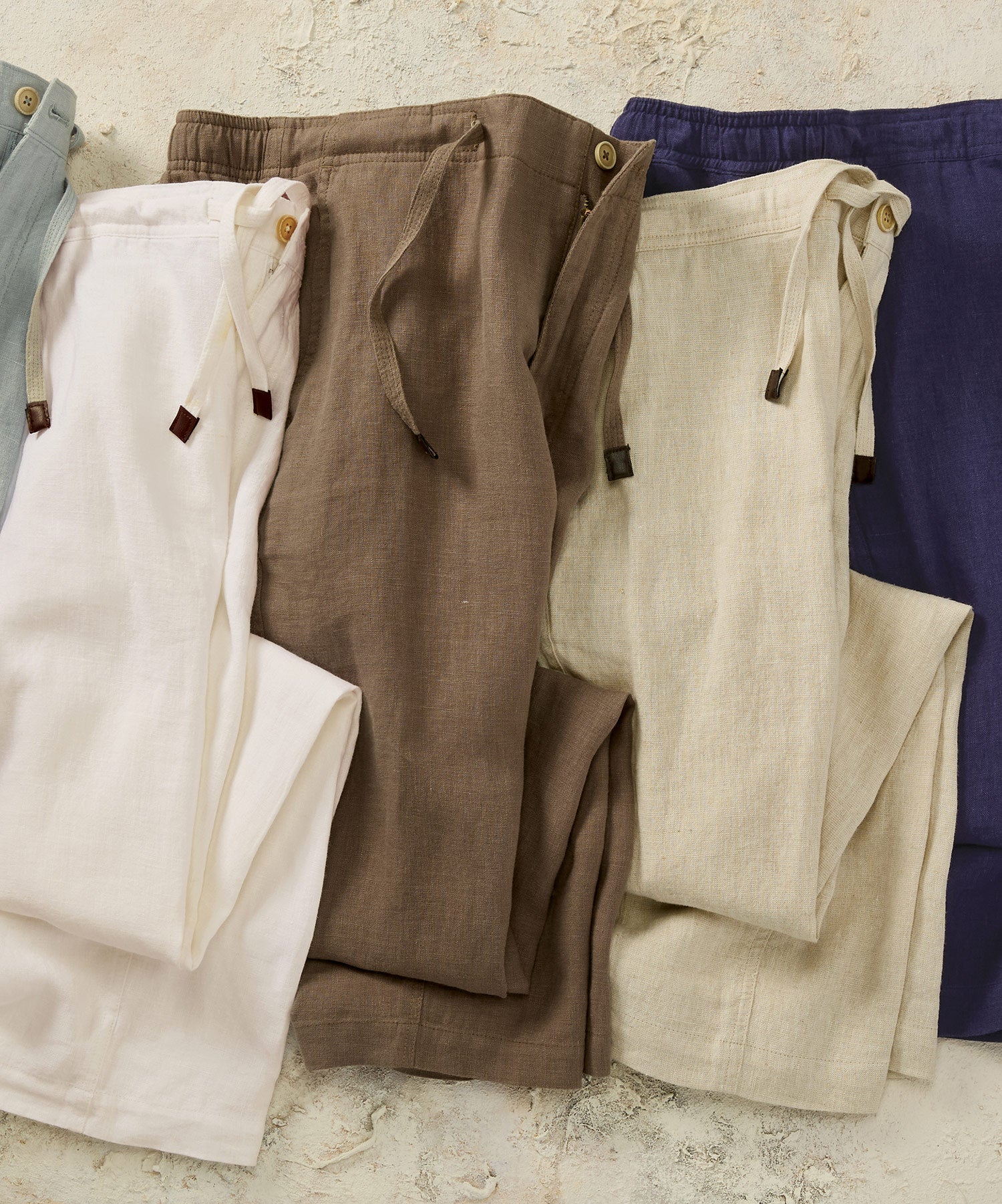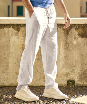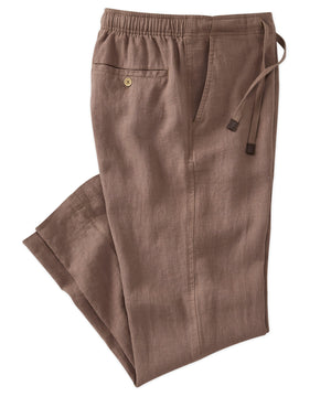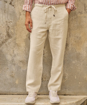 The flat-front design and single-button, zippered fly add a tailored look to this relaxed, drawstring style. Button-through rear pockets. 100% linen. Hand wash or dry clean.