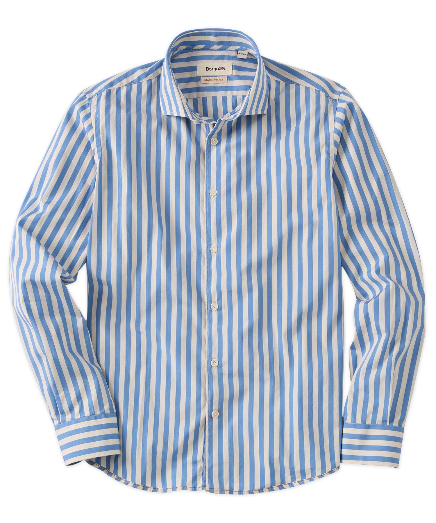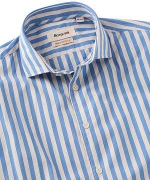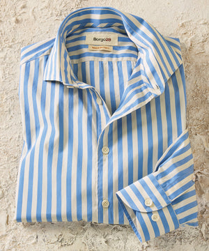 A modern statement in classic craftsmanship, this bold stripe sport shirt is made from 100% premium cotton. The blue stripe pattern delivers confidence, and the finely woven fabric offers a comfortable feel that wears effortlessly.