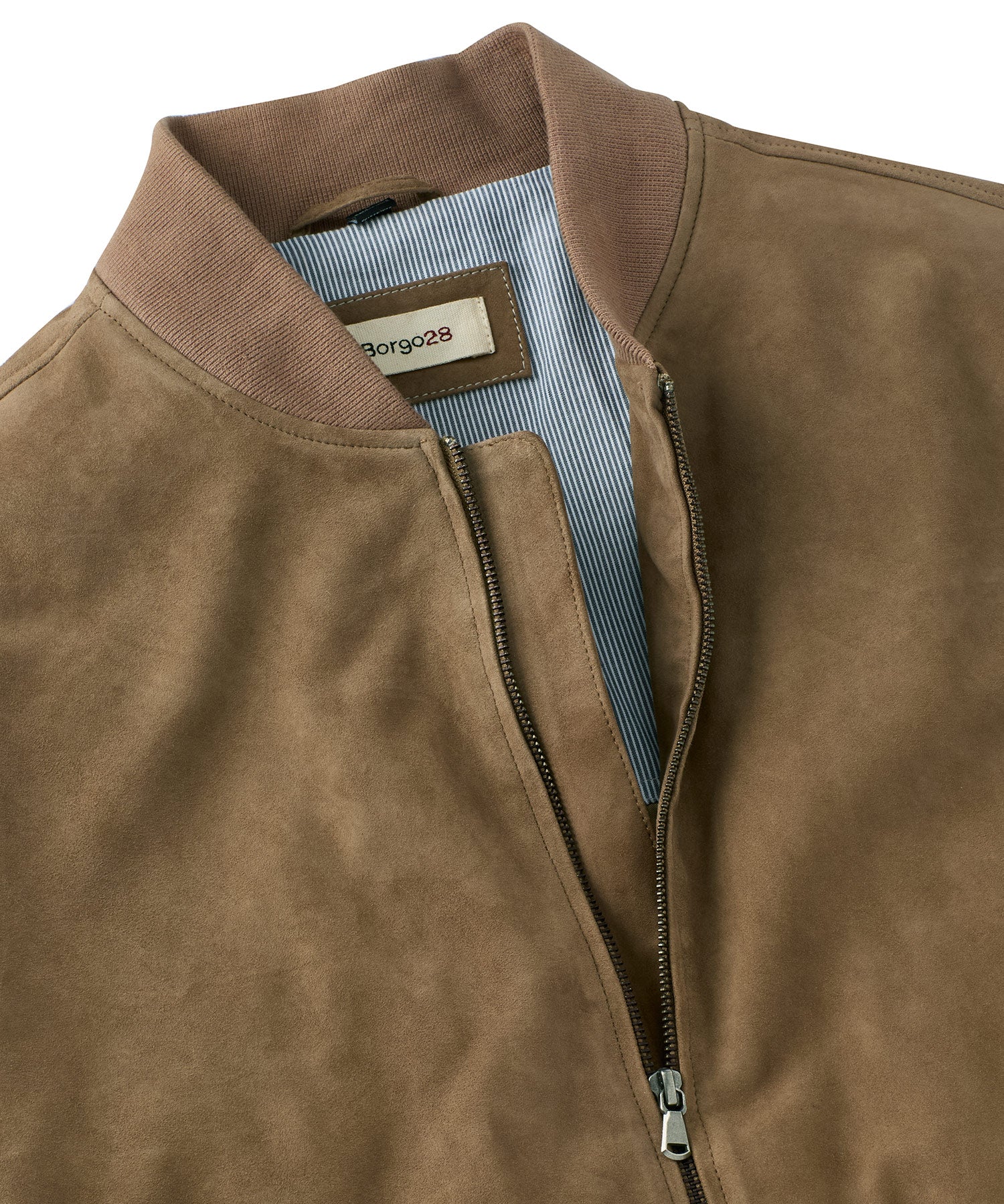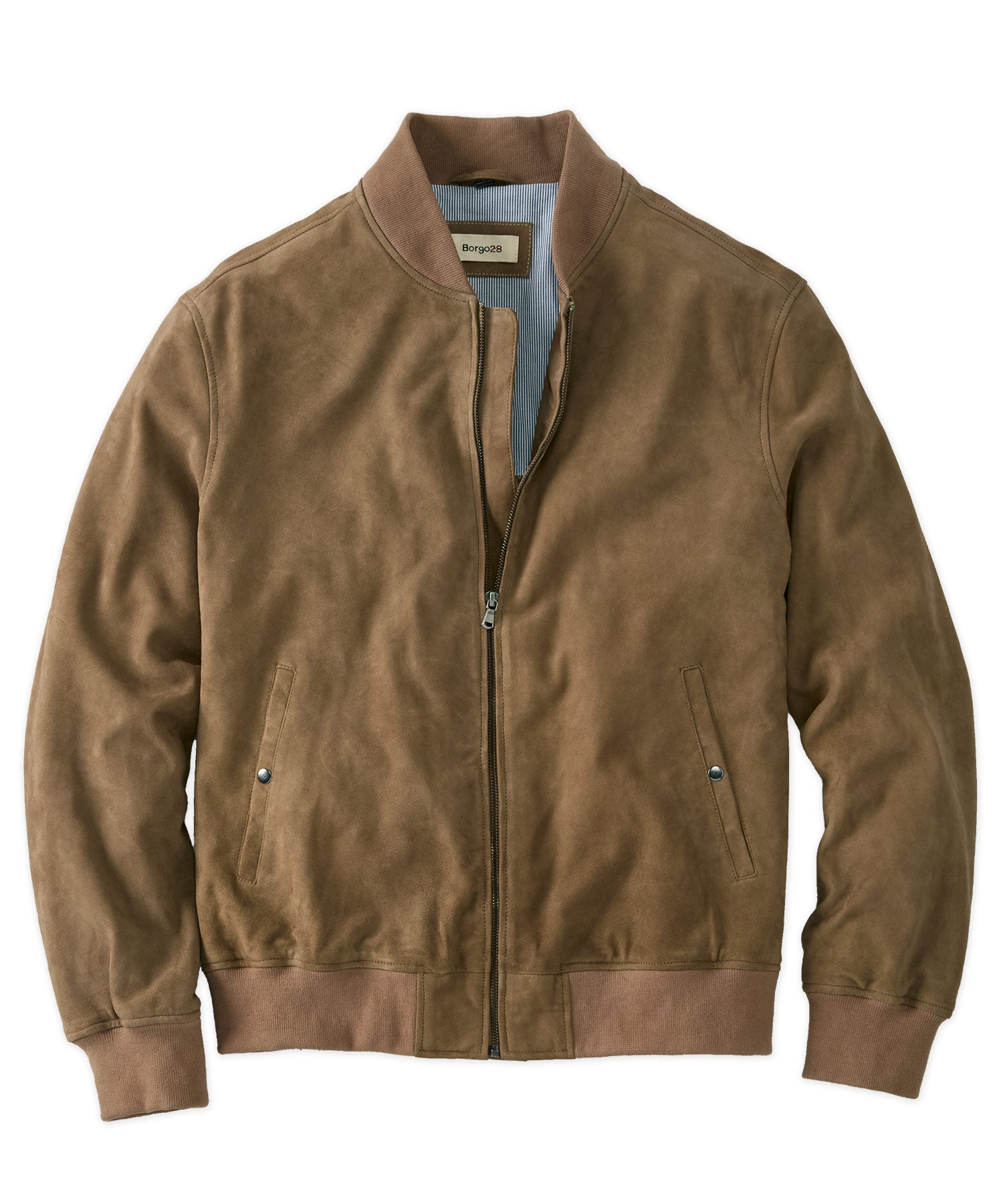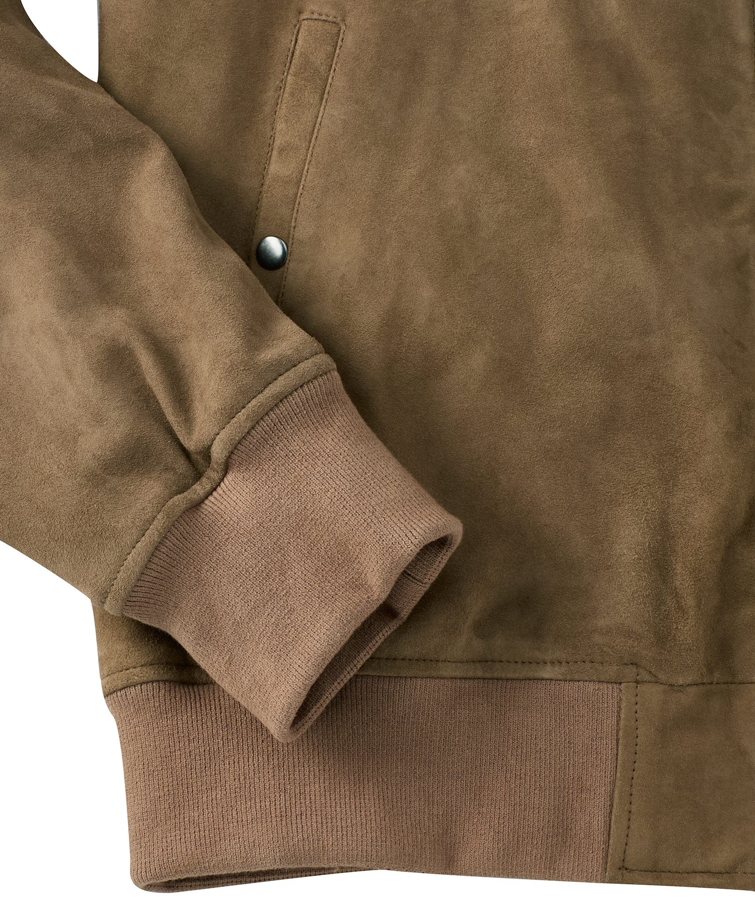 With its luxe feel and retro style, our suede bomber is an ideal outer layer. Zip-front style has ribbed knit collar, cuffs and waist. Front pockets with snap closures.