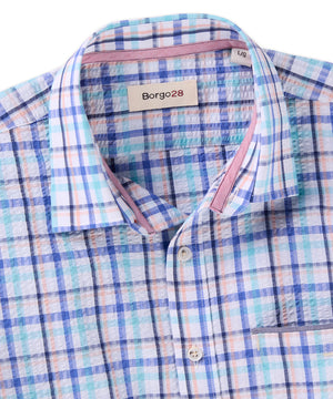 Classic seersucker comfort gets a fresh update with this colorful plaid that's perfectly in tune with the season. Button-front style with adjustable barrel cuffs. Chest pocket.